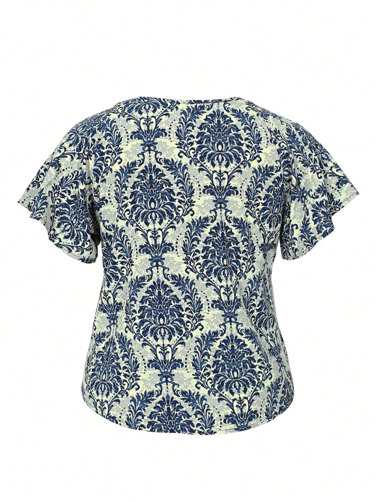 Plus Size Navy Blue Printed Loose V-Neck Short Sleeve Casual Shirt Blouse Top Women Commuter Casual Home