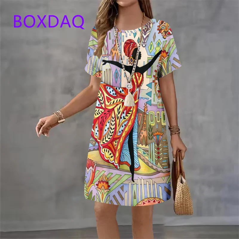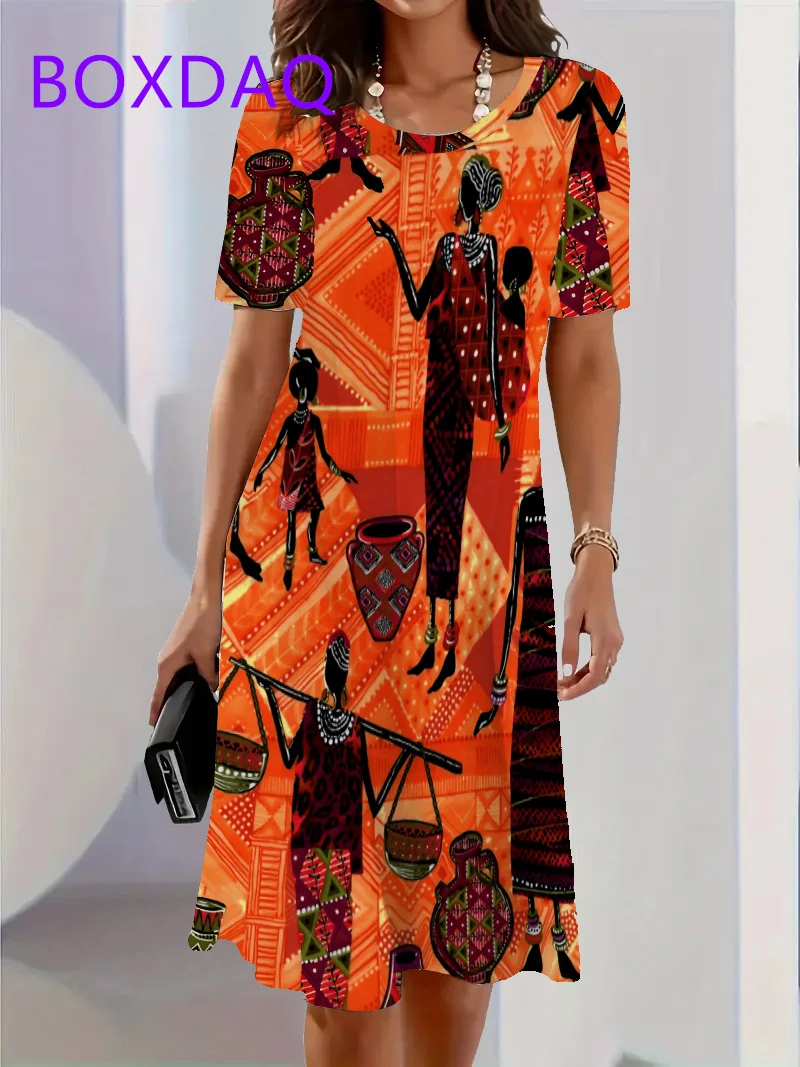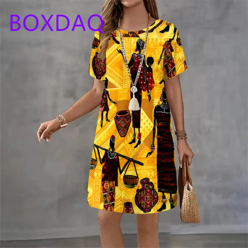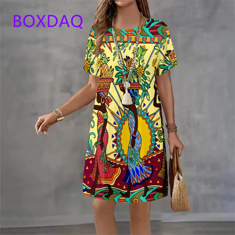 Retro African Style Print Women Dress New 2025 Summer Women Dress Streetwear Clothes Short Sleeve O-Neck Loose Casual Mini Dress